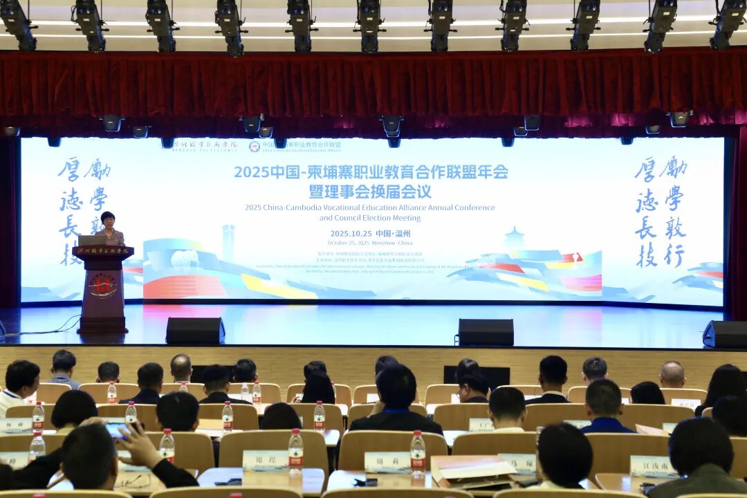 10月25日上午,在中国教育国际交流协会、柬埔寨劳工和职业培训部指导下,由温州职业技术学院、亚龙智能装备集团股份有限公司联合主办的2025中国-柬埔寨职业教育合作联盟年会暨理事会换届会议在我校召开。来自中柬两国职业教育领域的政府代表、院校领导、专家学者及企业代表等100余人齐聚一堂,共同探讨中柬职业教育合作与发展新路径。